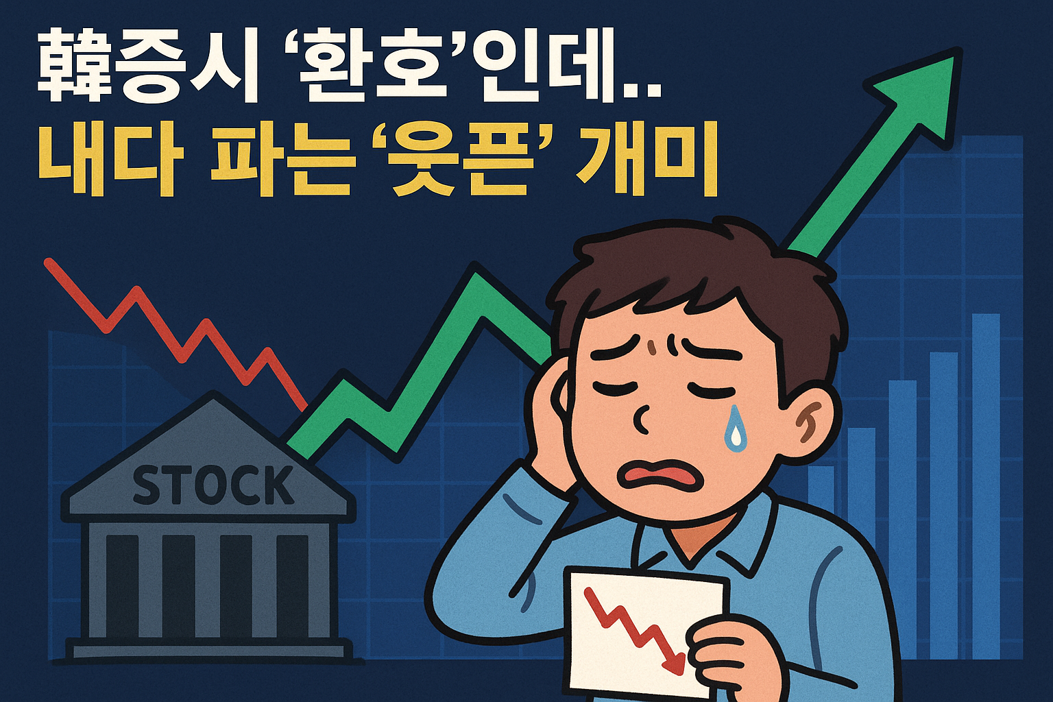 “웃픈(웃기면서도 슬픈)” 표현처럼, 승자는 있는 시장에서도 개미 투자자만이 차익 실현이나 시장 흐름의 끝자락에서만 매도하고, 실질적인 수혜는 기관/외국인 또는 대주주/정책 수혜 기업에게 돌아가는 구조가 반복되고 있다는 비판적 관점이 깔려 있음.
